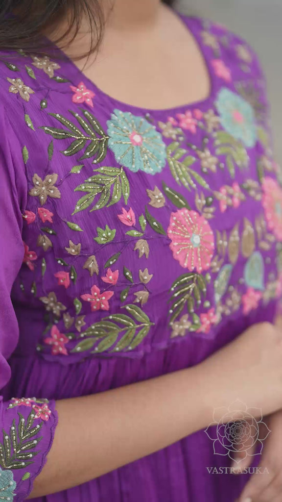 Pure chinnon 2 layered dress with heavy hand embroidery on yoke flare customised in small pleating for the flare