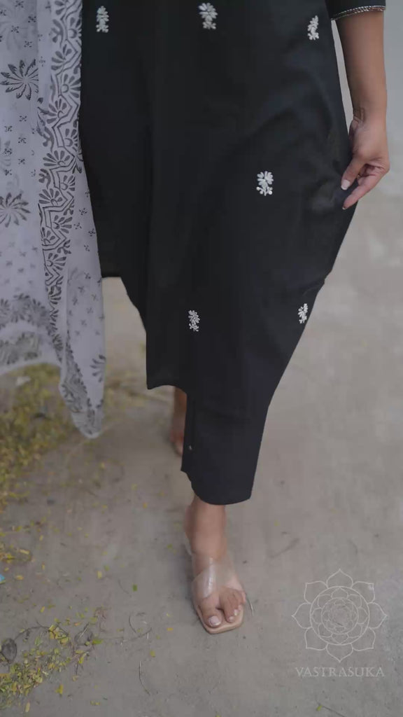 Black Kurti set in cotton with heavy thread work on the yoke paired with cotton pants and hand block printed chiffon dupatta