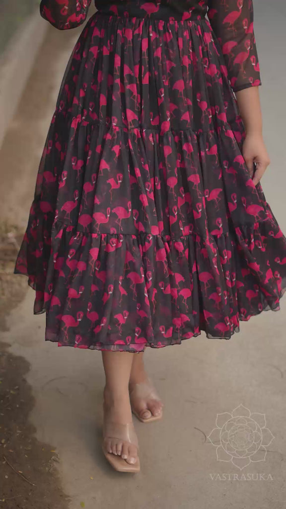 Black flamingo printed short dress in 3 layer printed soft falling chiffon fabric in 3 layer customised with full flare with inner lining perfect for any occasions