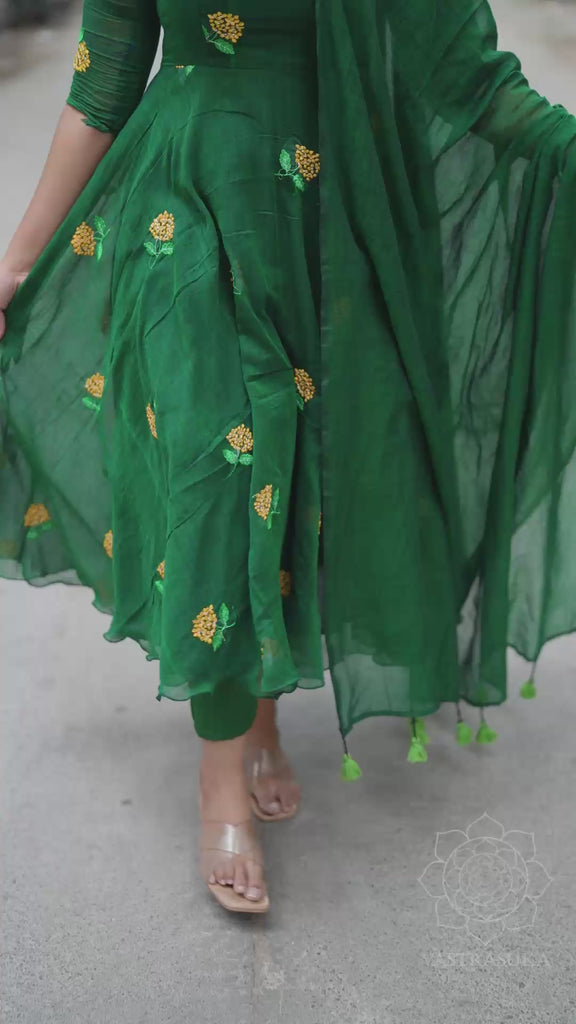 Pure mul cotton handloom Anarkali dress in full flare with all over emroidery in florals paired with plain dupatta
