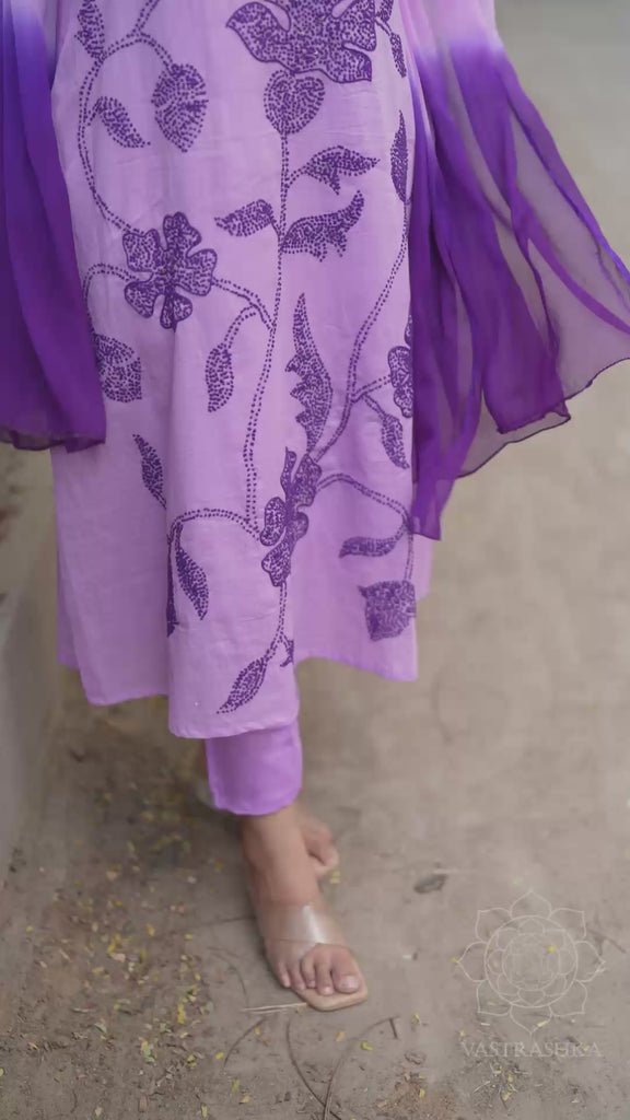 Pure mul cotton Anarkali set with hand knot work all over the Anarkali in big floral pattern paired with ombré chiffon dupatta and cotton pants