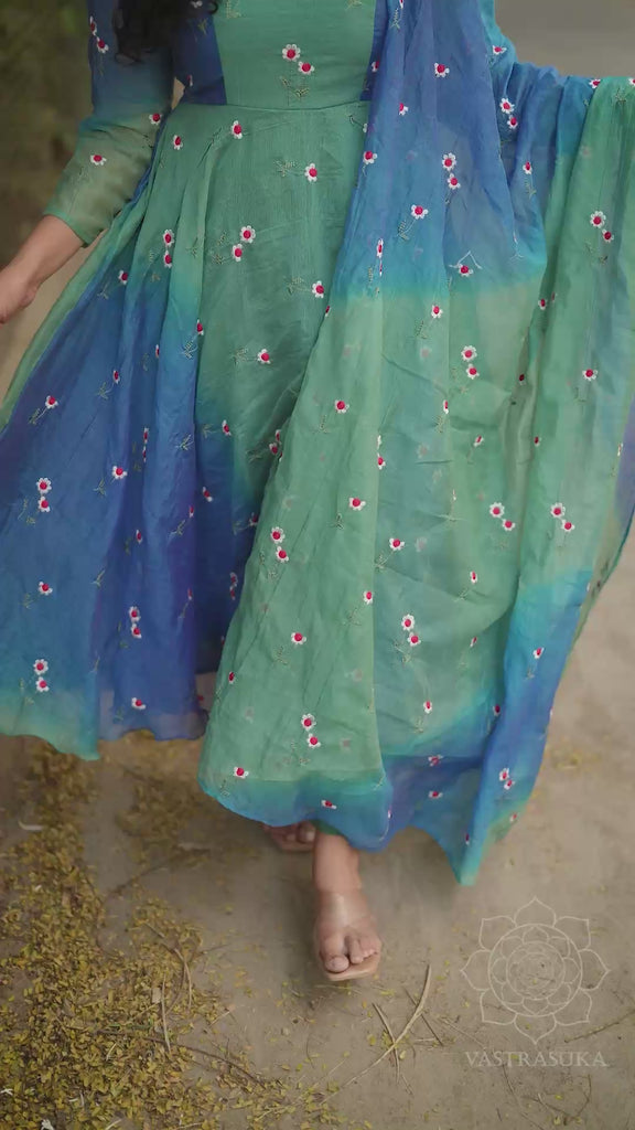 Mul chanderi Anarkali dress with in dual colour shades with all over thread floral butties paired with self dupattas and crape pants